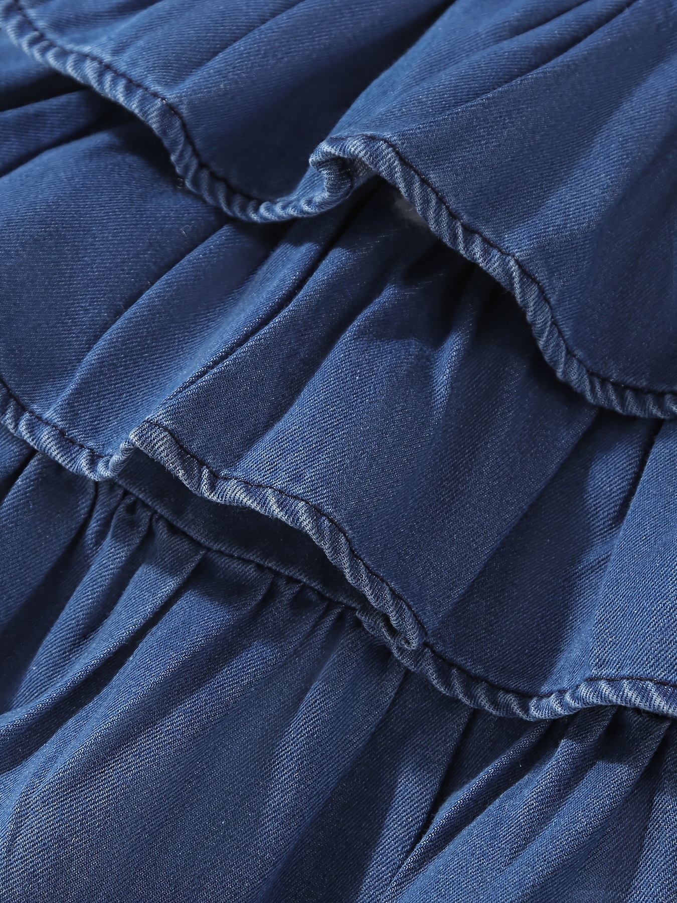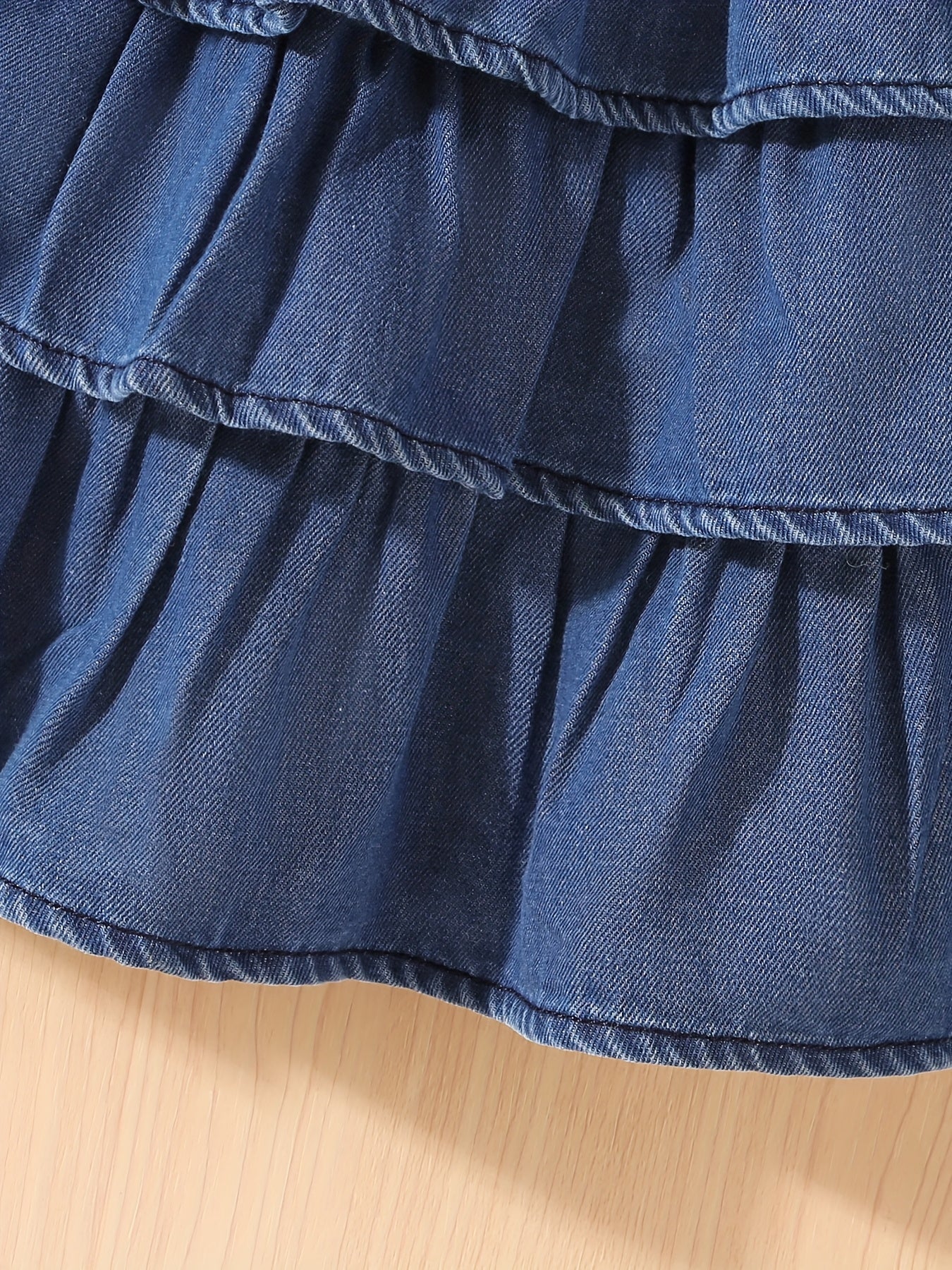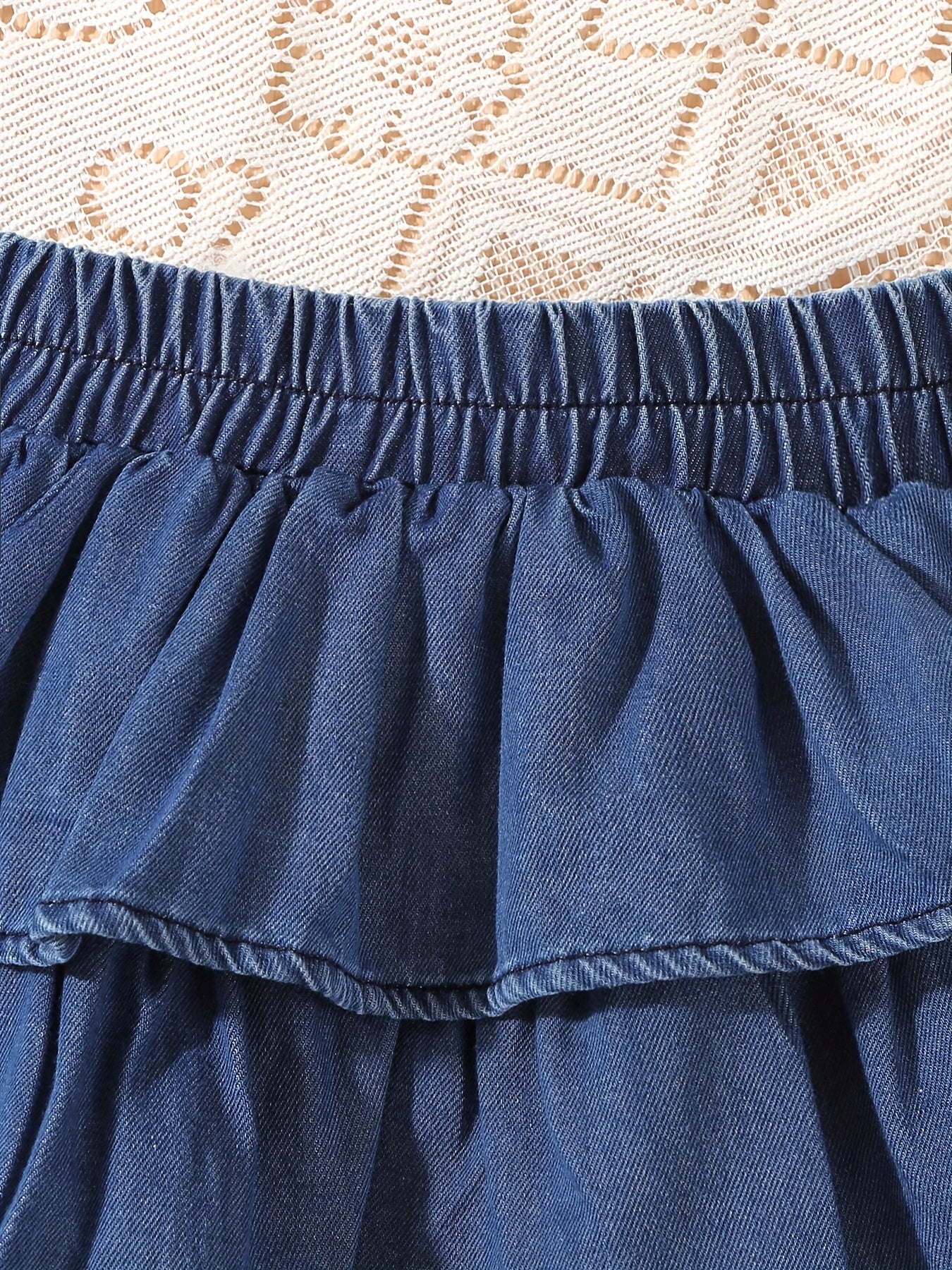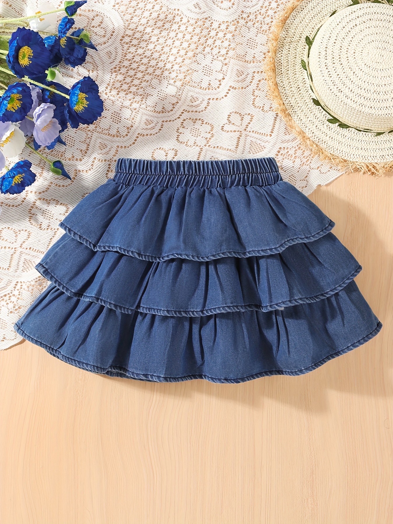 Girls' Summer Denim Skirt with a Cake Design, Featuring Multiple Layers of Ruffles and an Elastic Waistband, Fresh and Cute.