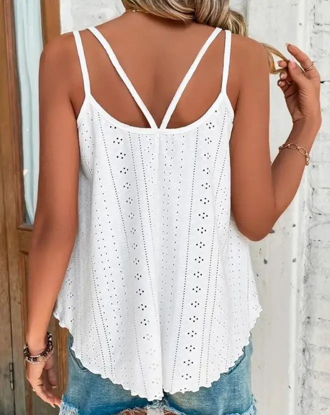 Highlight your unique style with this New Fashion 2023 Casual Summer Sleeveless Tank Top. Its eyelet embroidery, double strap design, and lightweight fabric offer comfort and breathability, perfect for any summer occasion. Show off your modern fashion with this stylish and comfortable top.