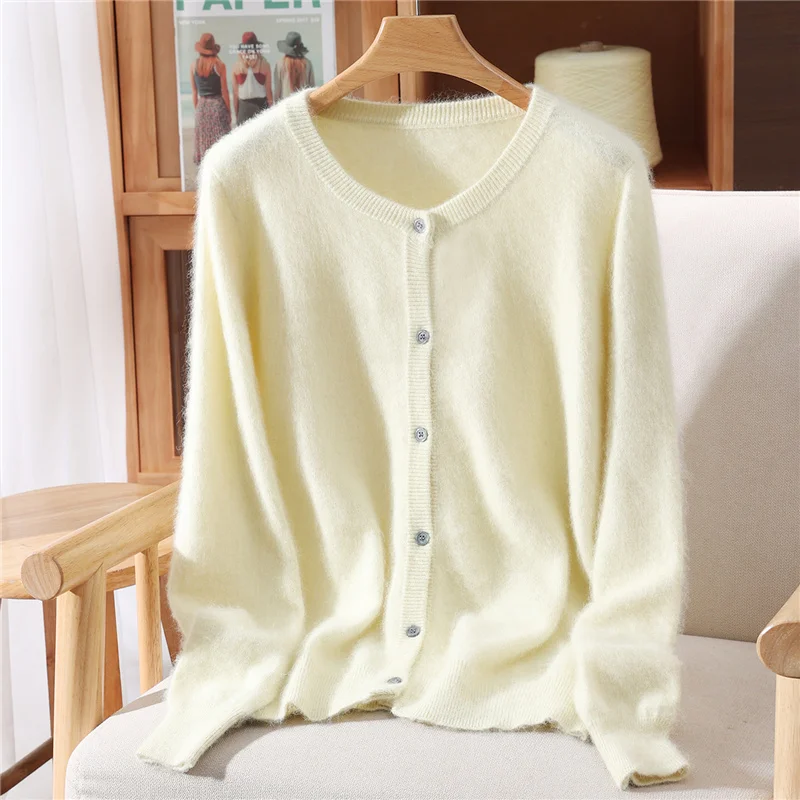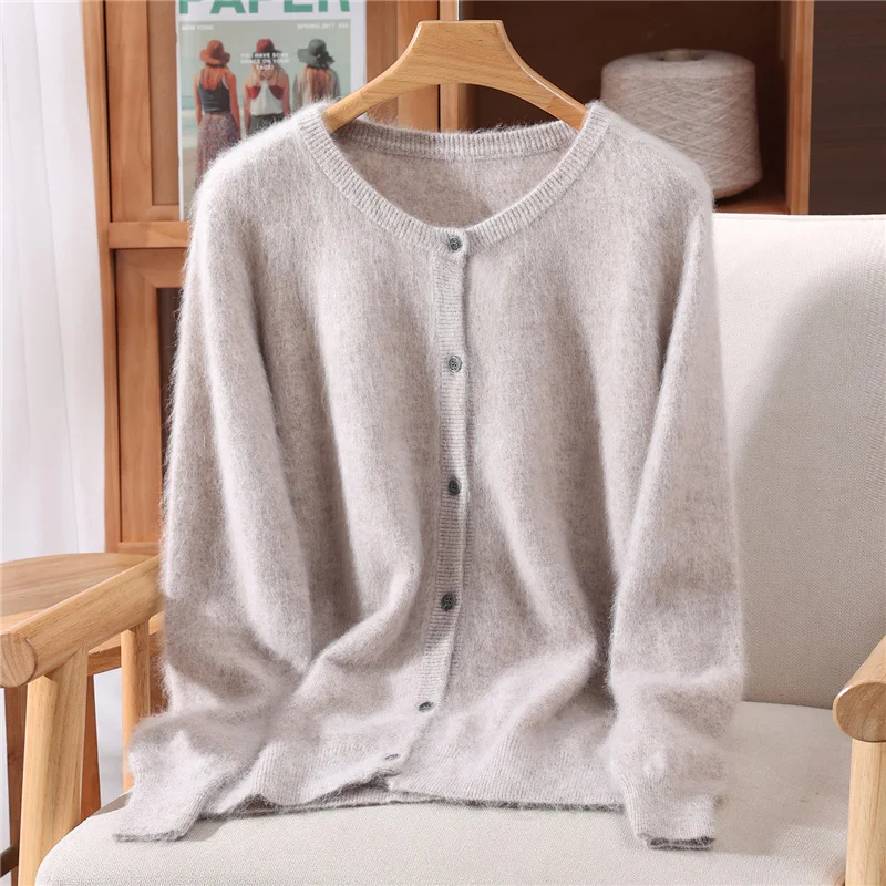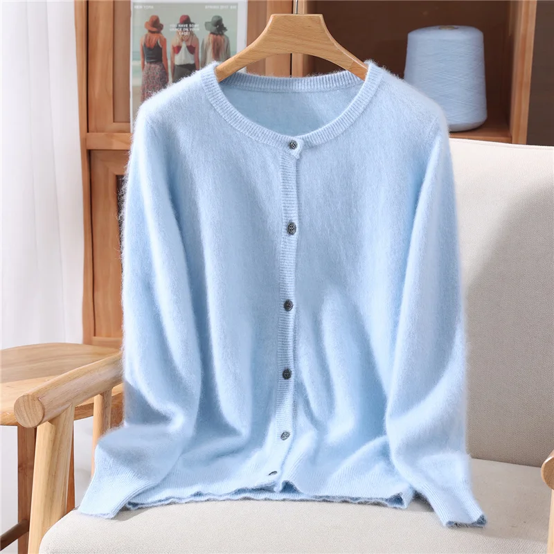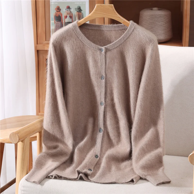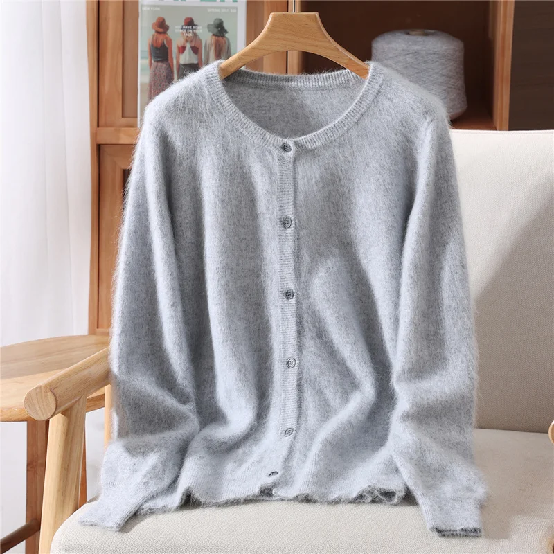 New Women 100% Mink Cashmere Sweater O-Neck Buttons Cardigan Autumn Winter Soft Warm Cable Kint Sweater Casual Long Sleeve Tops