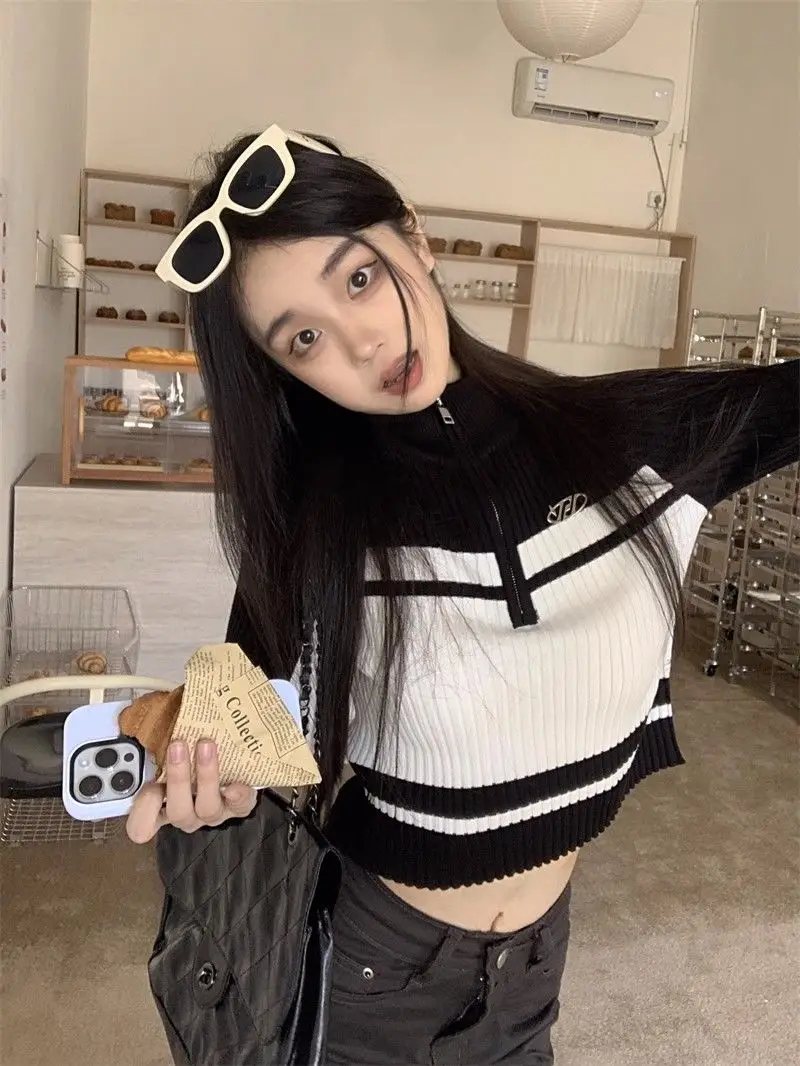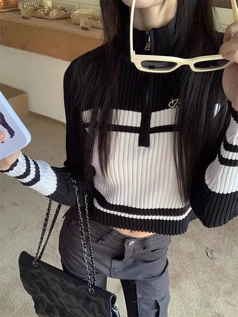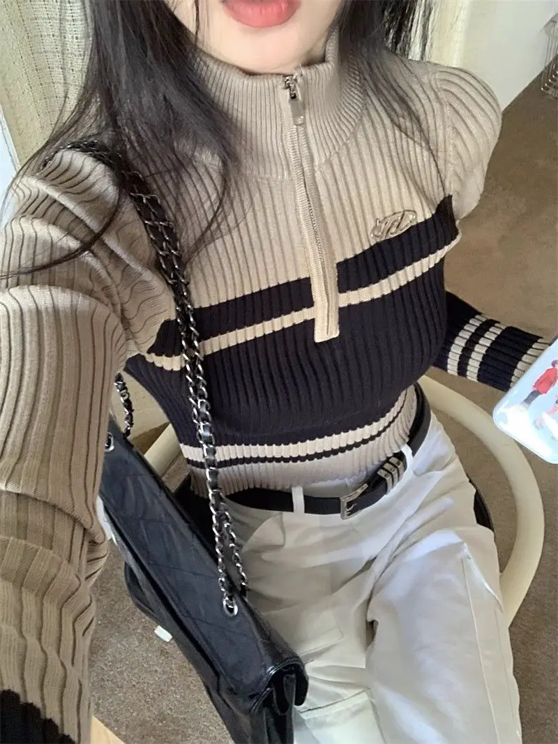 Crafted for the modern woman, this patchwork long-sleeve sweater combines contemporary design with everyday comfort. Featuring a refined stand-up collar, full-length sleeves, and a streamlined silhouette, it delivers a polished look suitable for autumn and winter seasons. The zipper detailing adds functional sophistication, while the slim fit flatters the frame. Constructed from a polyester and spandex blend, the garment offers subtle stretch for ease of movement without compromising its structured appearance. The solid color palette ensures versatility across various styling options, making it an essential addition to any casual wardrobe.