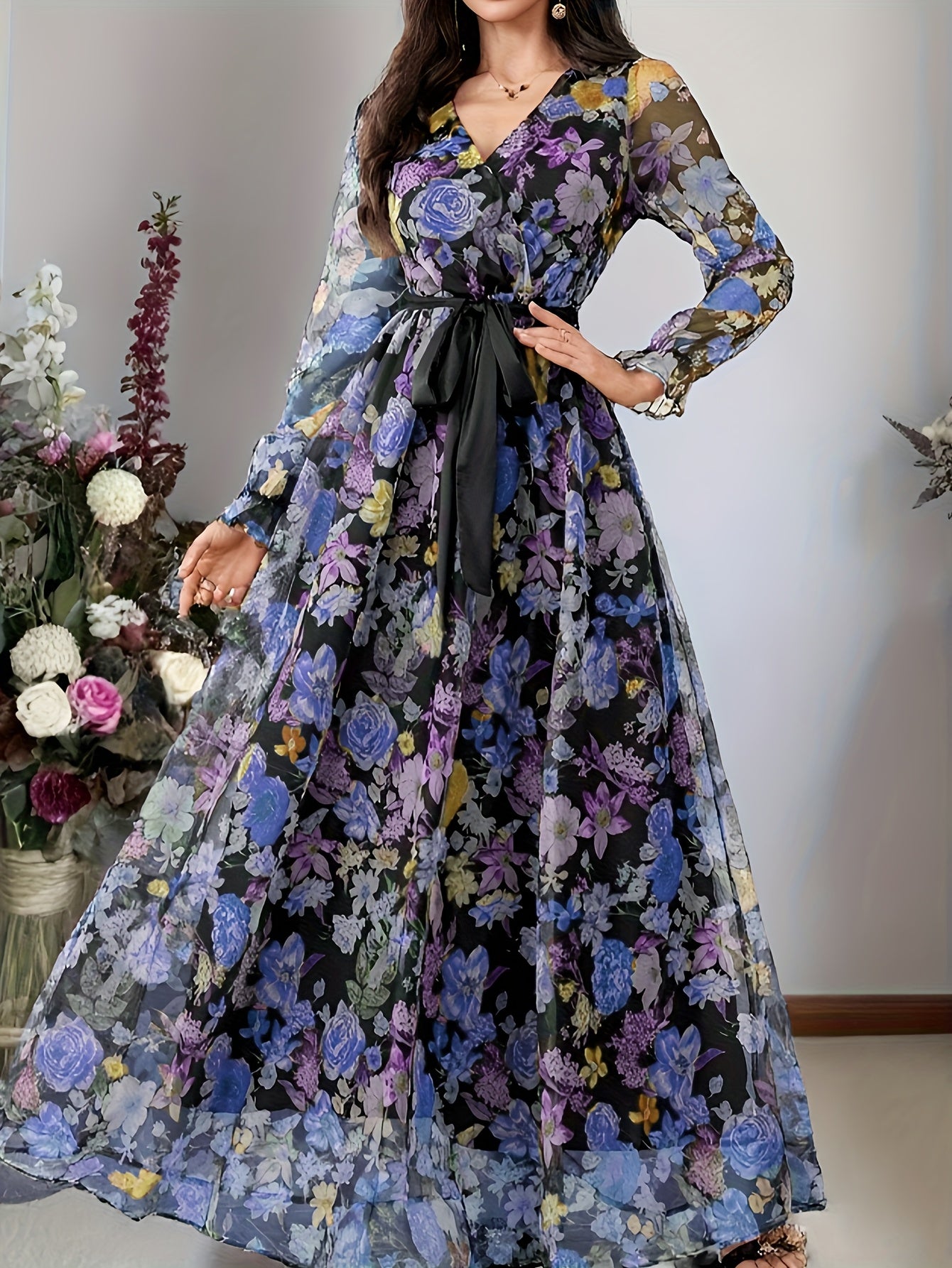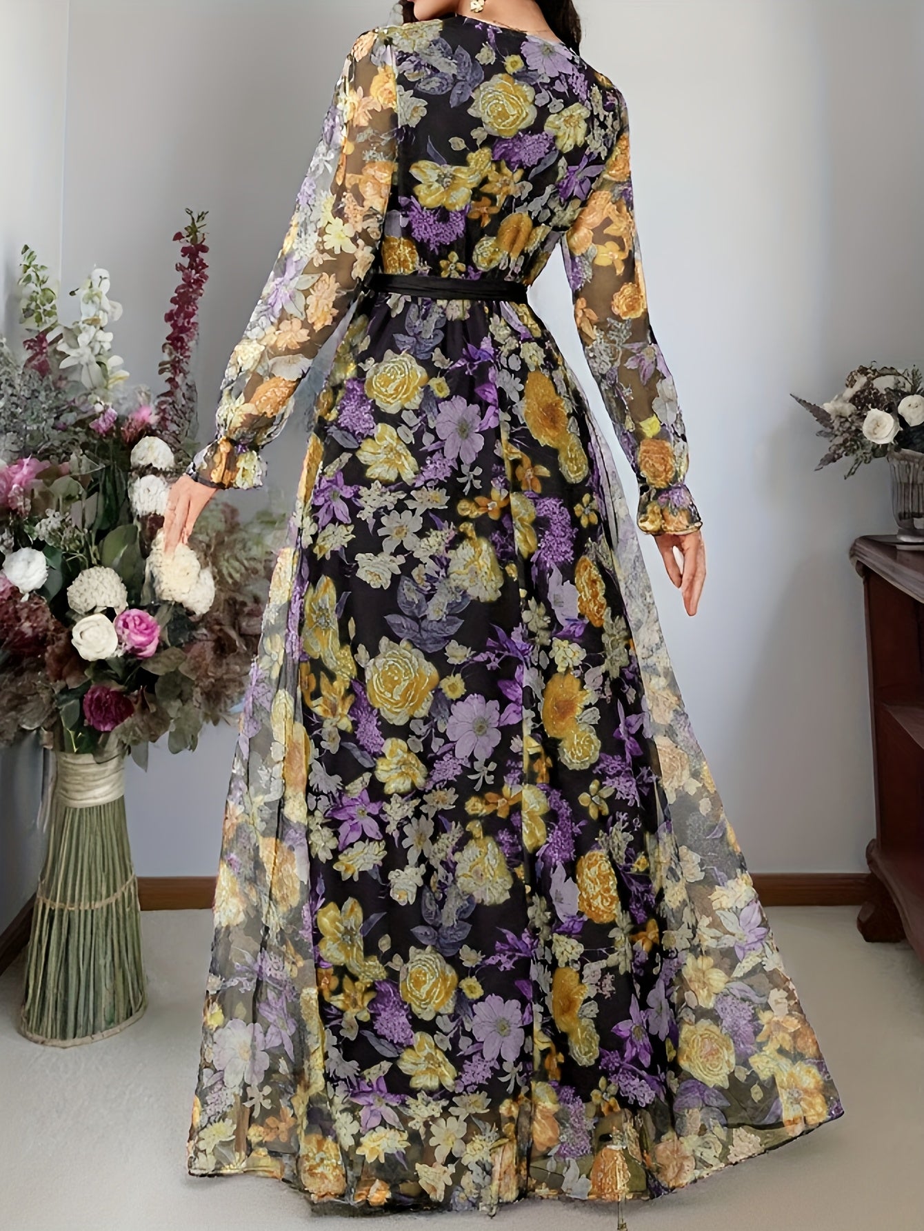 Sophisticated maxi dress featuring a refined cross-collar design and romantic floral mesh print. The lantern sleeves and defined waist create an elegant silhouette, while the oversized swing cut ensures graceful movement. Perfect for holiday celebrations and special occasions. Designed for adult wearers seeking timeless style with contemporary flair.