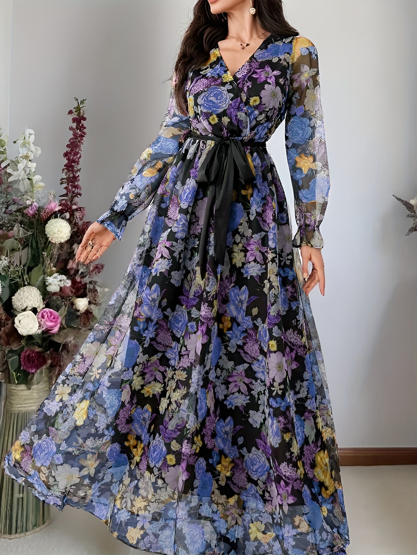 New elegant ladies cross collar lantern long sleeve waist oversized swing floral fashion mesh print romantic holiday maxi dress