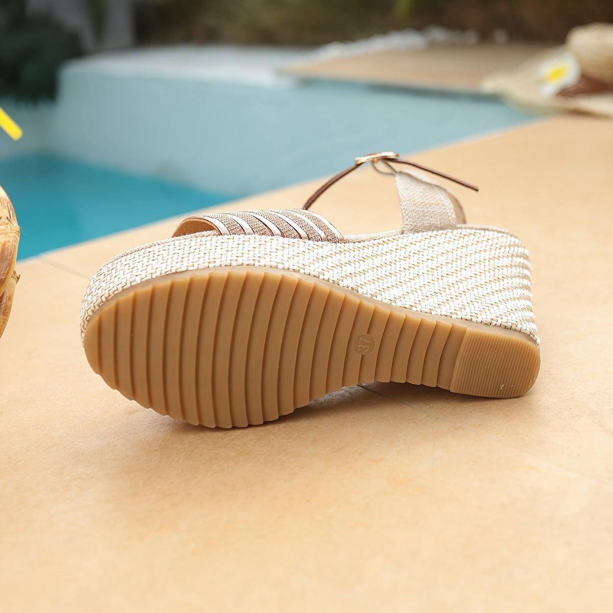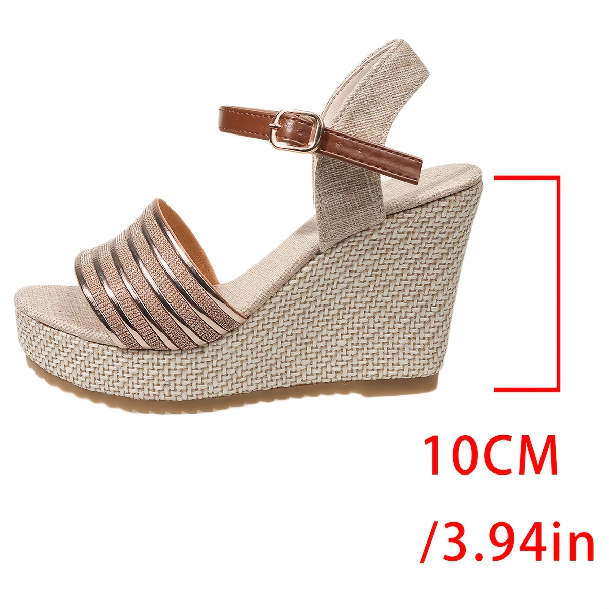 Step up your summer style with these sophisticated women's fashion sandals. Featuring a sturdy, thick platform and elegant woven wedge design, these open-toe sandals deliver both comfort and contemporary flair. The metal stripe accents and rich brown buckle closure add refined detailing, while the fabric upper pairs seamlessly with a synthetic inner lining for durability. Supported by a reliable rubber sole and fabric insole, these versatile sandals transition effortlessly from casual outings to polished occasions.