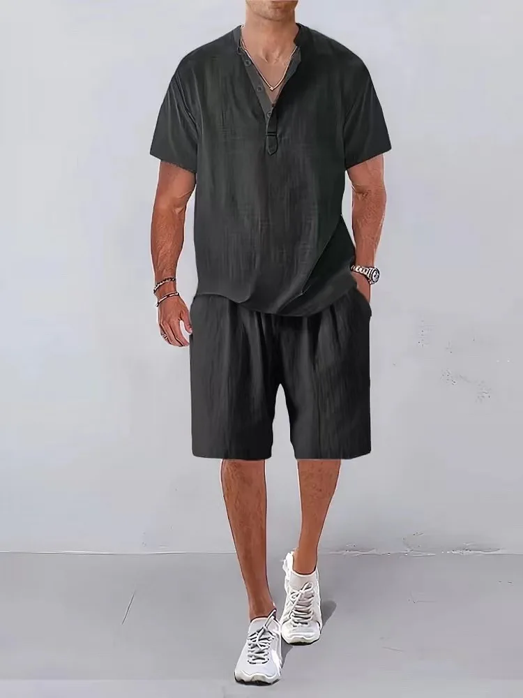 Summer Linen Outfits Short Sleeve Polo Shirt+Shorts
