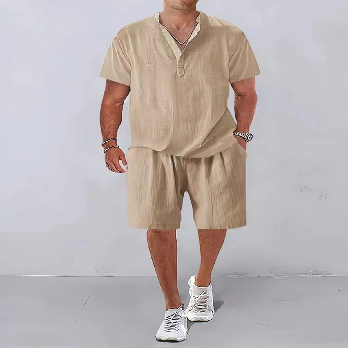 - Convenient Details: The shirt features a stand collar with single-breasted closure, while the shorts come with an elastic waist for a perfect fit. Plus, decorative buttons and pockets add a touch of practicality and style.
